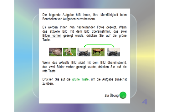 Az NBACK képzési programban a kliens egy digitális képkeret ábrázolását látja a képernyőjén. Fényképek sorozata látható a keretben; a fotók különböző témájúak (állatok, tájak, színek stb.). A kliensnek el kell döntenie, hogy az aktuális kép megegyezik-e azzal, amit egy, két vagy három hellyel hátrébb mutattak (a helyek száma szinttől függően változik). Ha egyezik, meg kell nyomnia a zöld gombot. Ha nem egyezik, meg kell nyomni a piros gombot.
