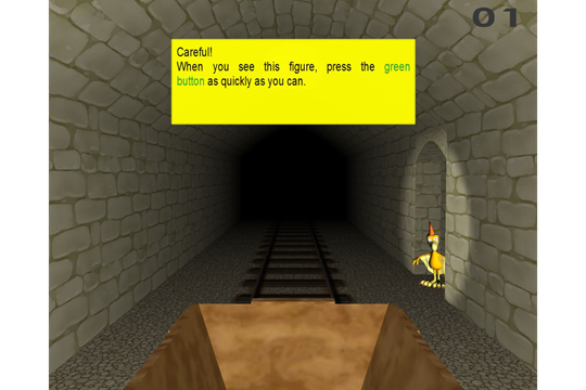 Az ügyfél egy alagúton halad át egy bányakocsival. Releváns és irreleváns ingerek (optikai, akusztikus vagy keresztmodális) bukkannak elő hirtelen a sötétségből. A kliens feladata, hogy csak a megfelelő ingerekre válaszoljon. Amennyiben későn reagál egy megfelelő ingerre, vagy egyáltalán nem reagál, akkor negatív visszajelzést kap ( mennydörgés, villámcsapás) Amikor a kliens hibásan reagál egy nem megfelelő ingerre, az ábra vagy a hangforrás pirosan világít.